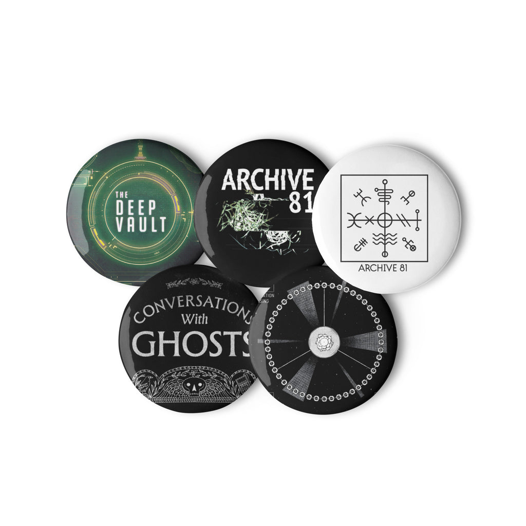 These are pins with the logos of Conversations with Ghosts, Archive 81, Generation Crossing, and The Deep Vault... all of our projects! Here's more info about the pins